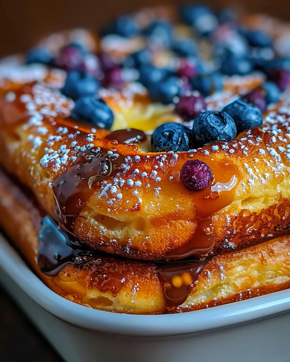Once out of the oven, resist the urge to slice right in! Allow your pancake casserole to cool for about 10-15 minutes. This helps set the structure and makes serving much easier. When you cut into it, you’ll find fluffy layers, juicy blueberries, and a texture that’s simply irresistible.
