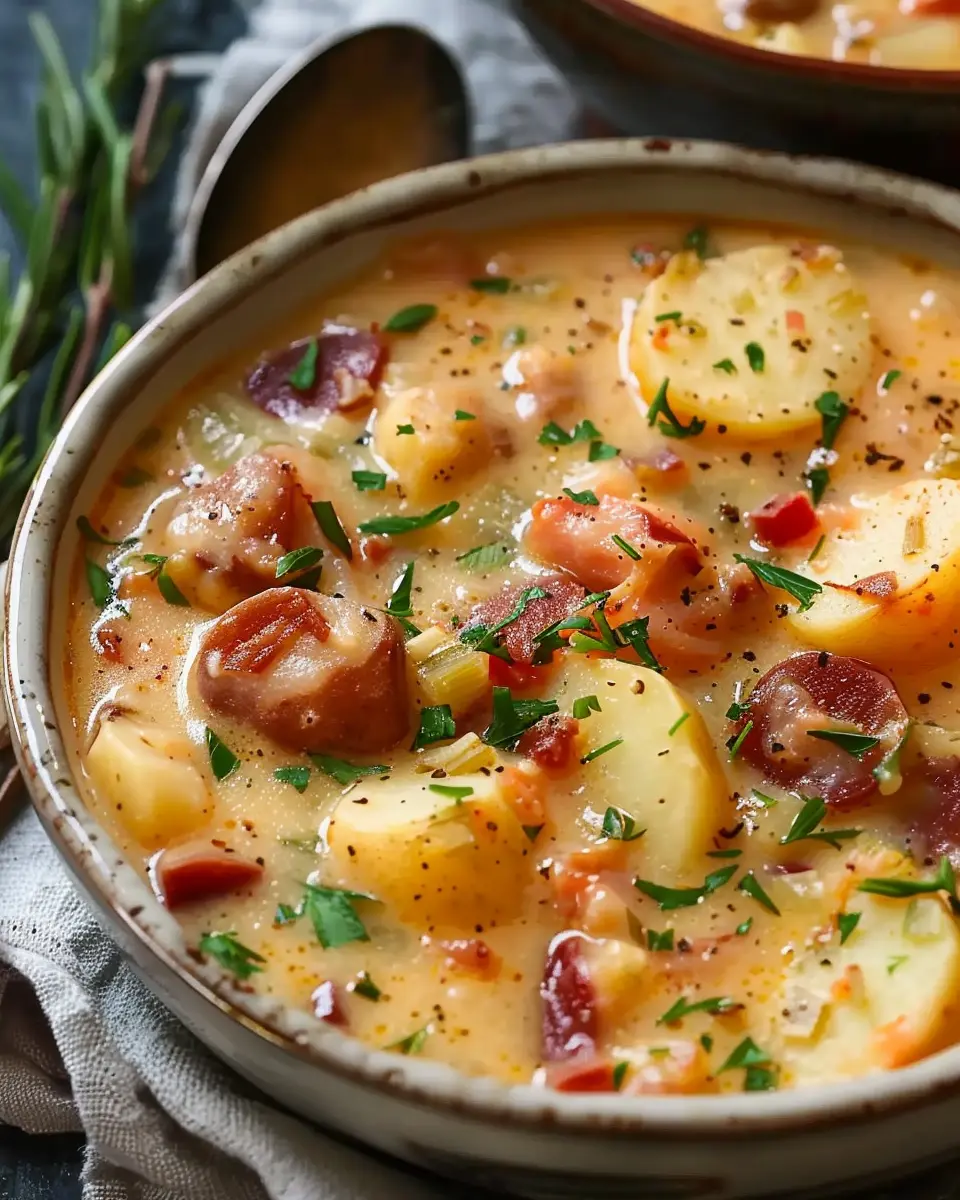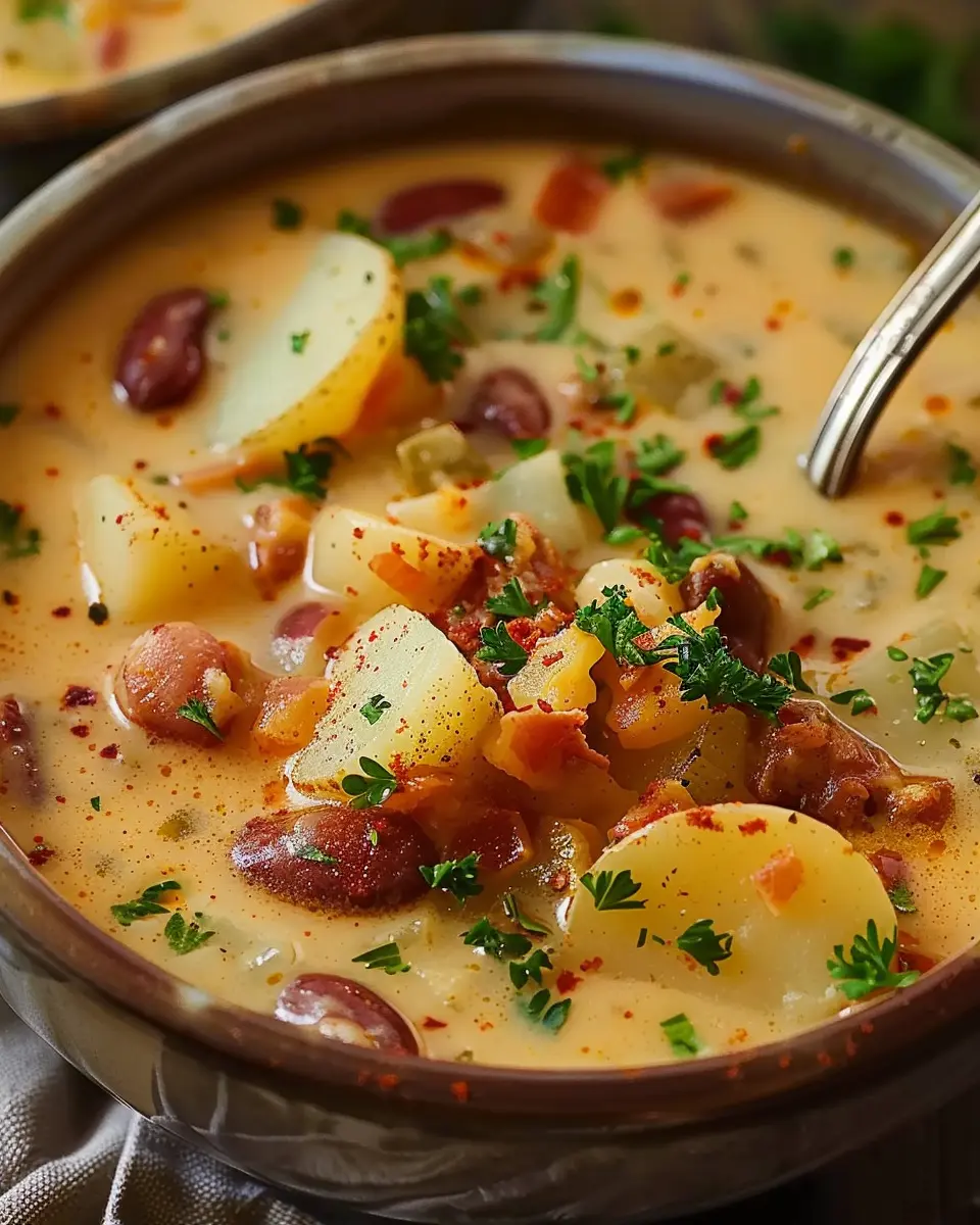 A comforting and hearty Cajun Potato Soup made with turkey bacon and chicken ham, perfect for chilly days.