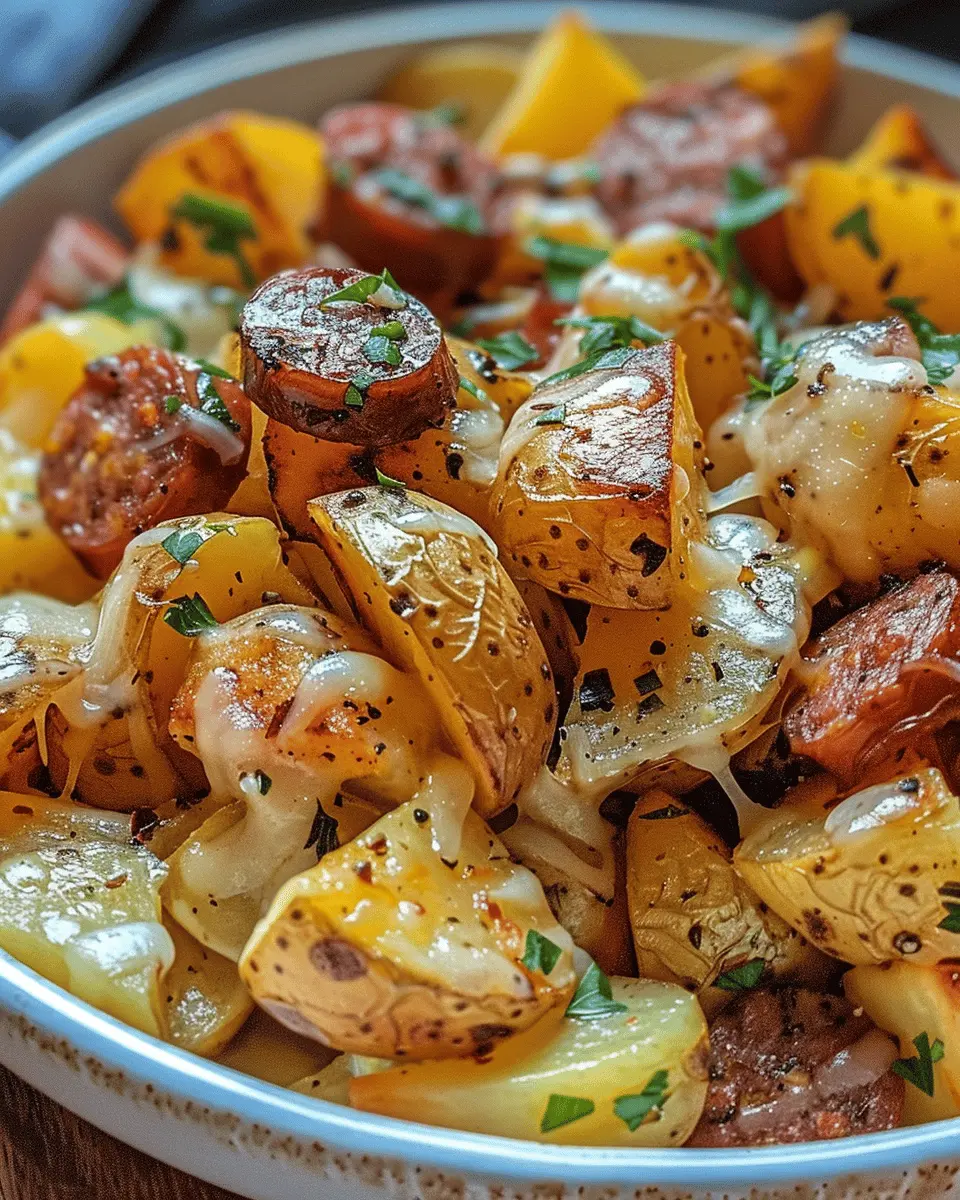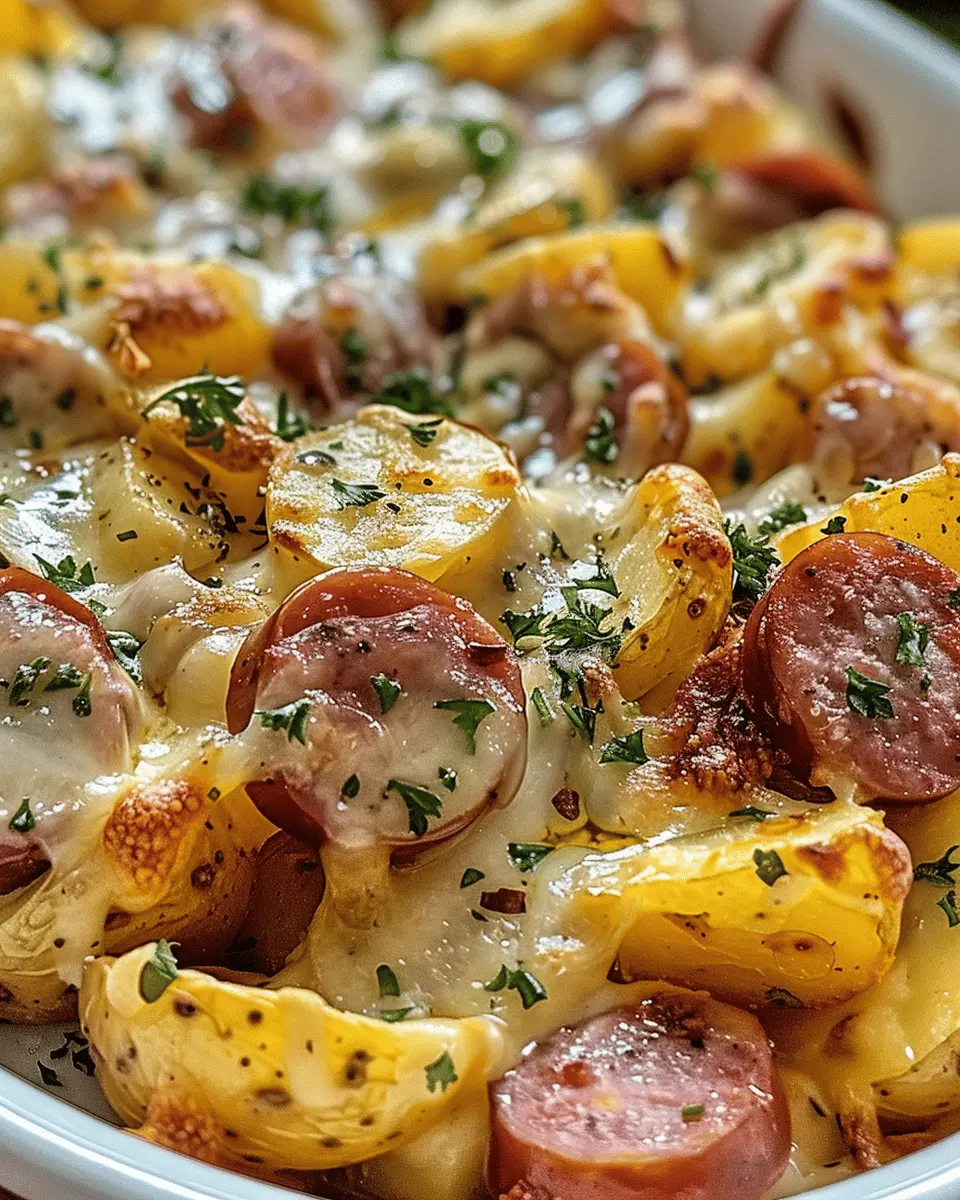 A delicious combination of cheesy potatoes and smoked sausage, perfect for indulging in comfort food.