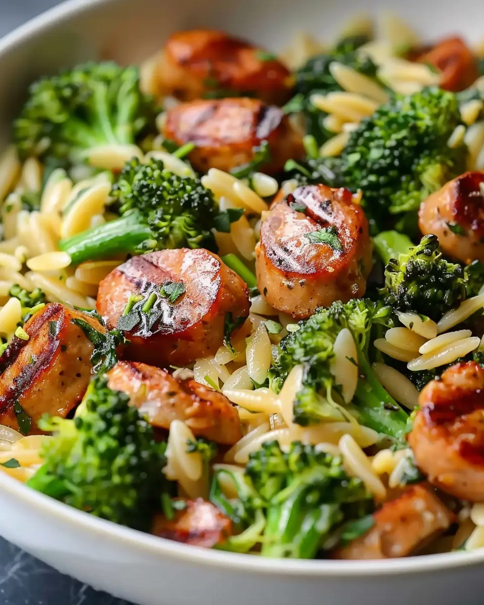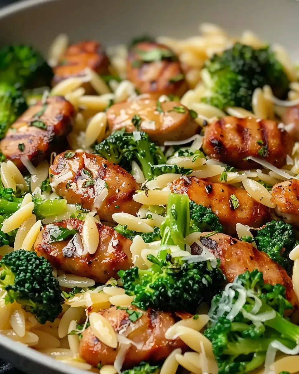 A quick and flavorful meal featuring chicken sausage and broccoli in orzo.