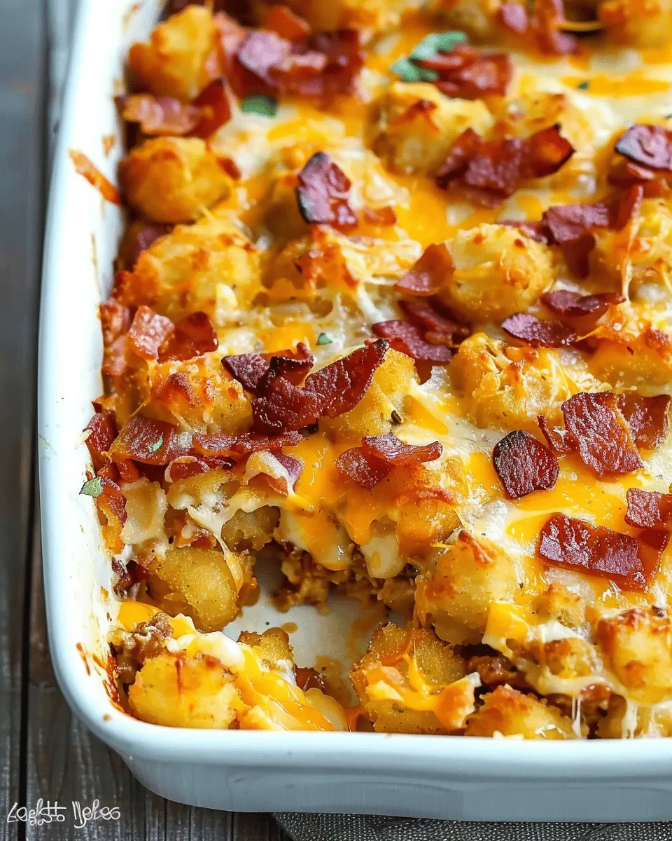 A deliciously indulgent breakfast casserole featuring crispy tater tots and creamy cheese.