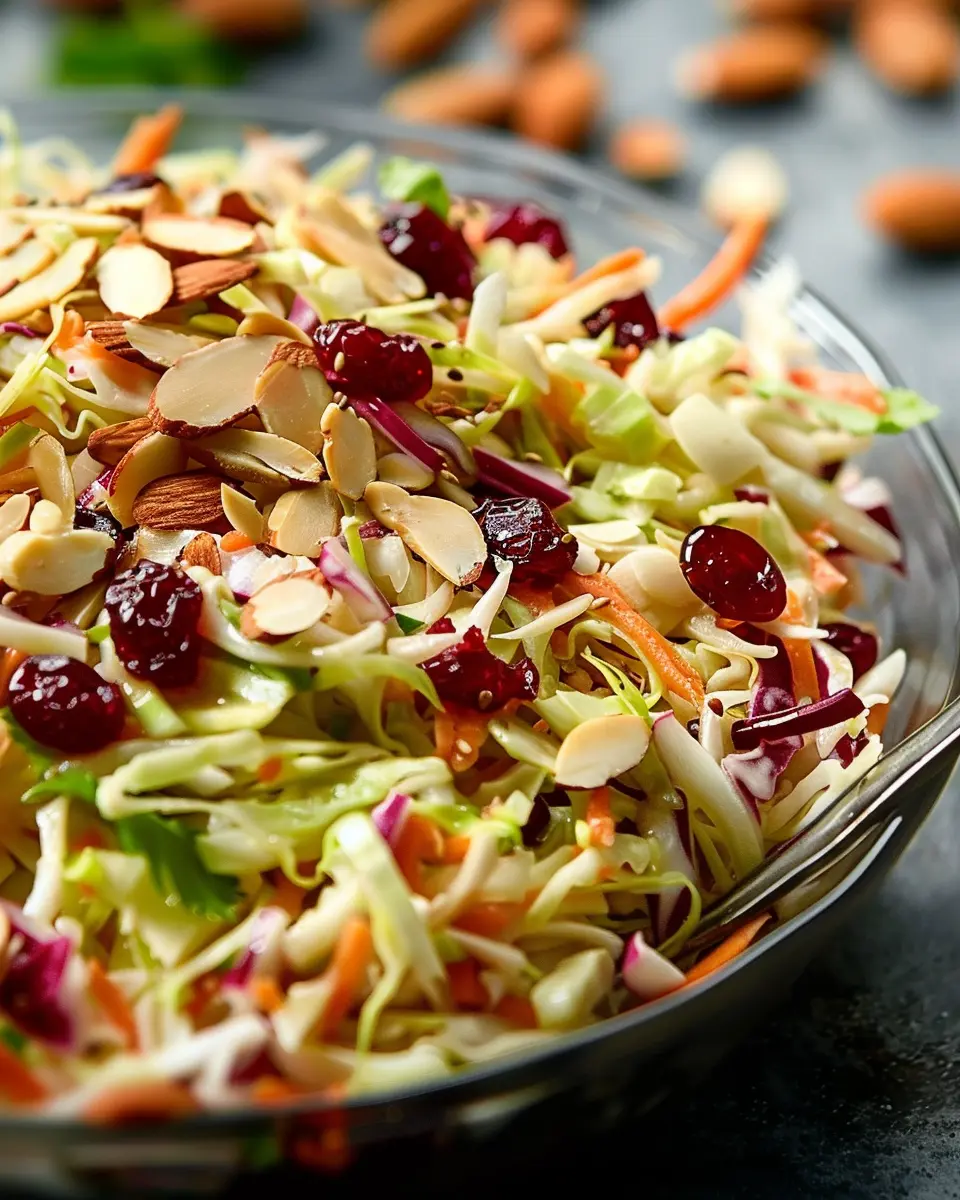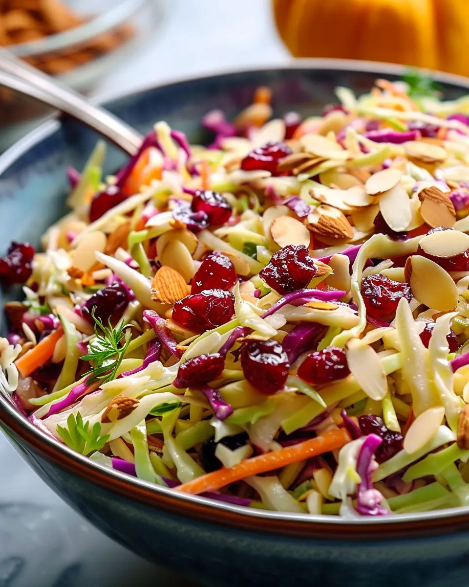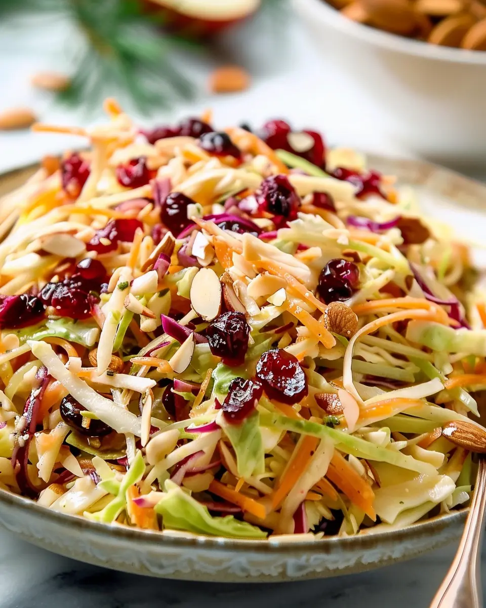 A delightful and festive slaw perfect for Thanksgiving, combining the tartness of cranberries with the crunch of almonds.