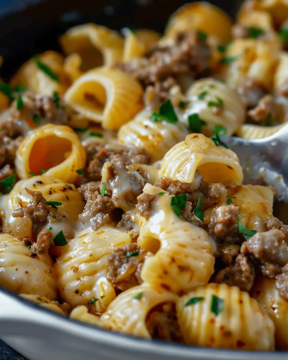 A creamy and savory beef and shell pasta dish that provides a comforting meal for any occasion.