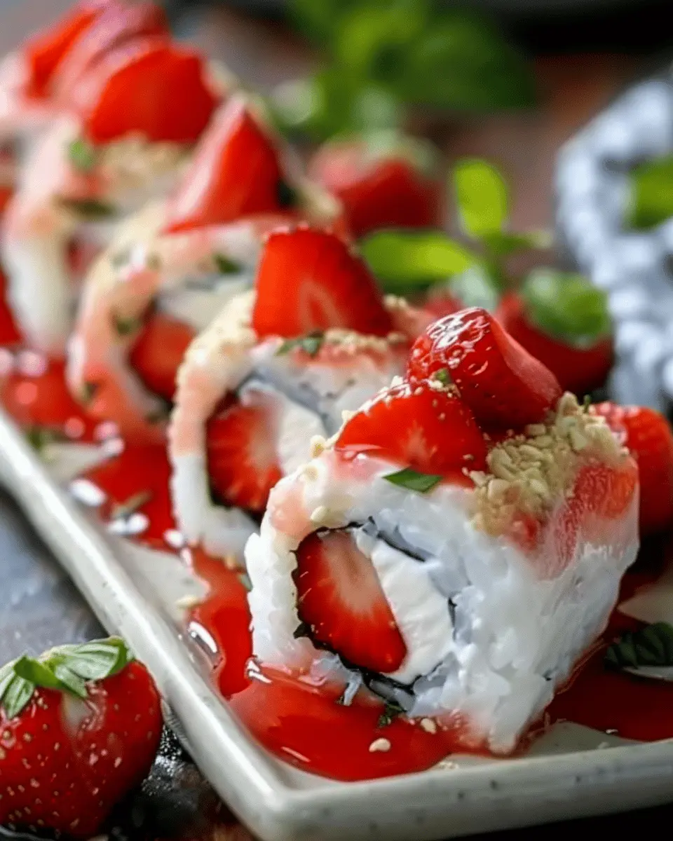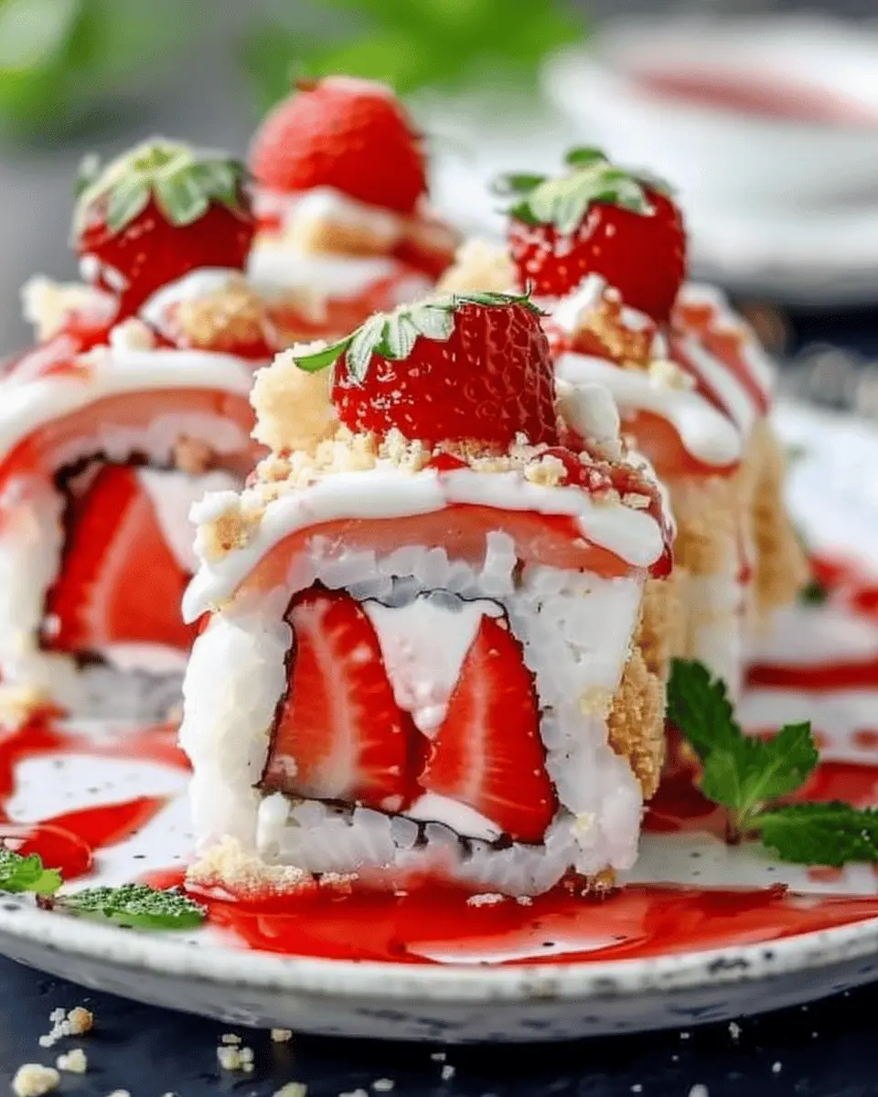 This delightful dessert combines the flavors of strawberry shortcake with the fun presentation of sushi rolls.
