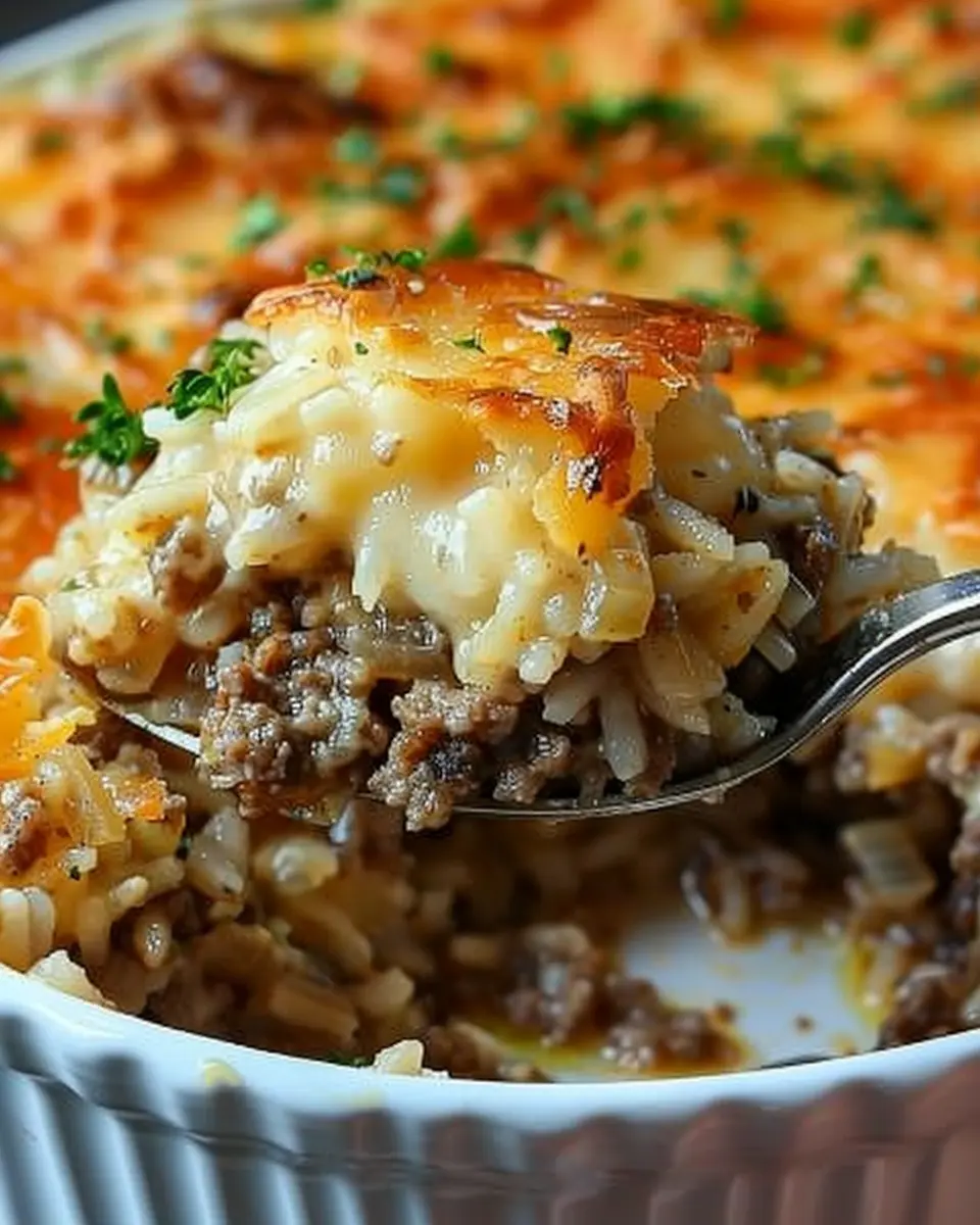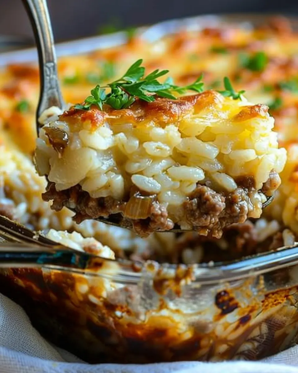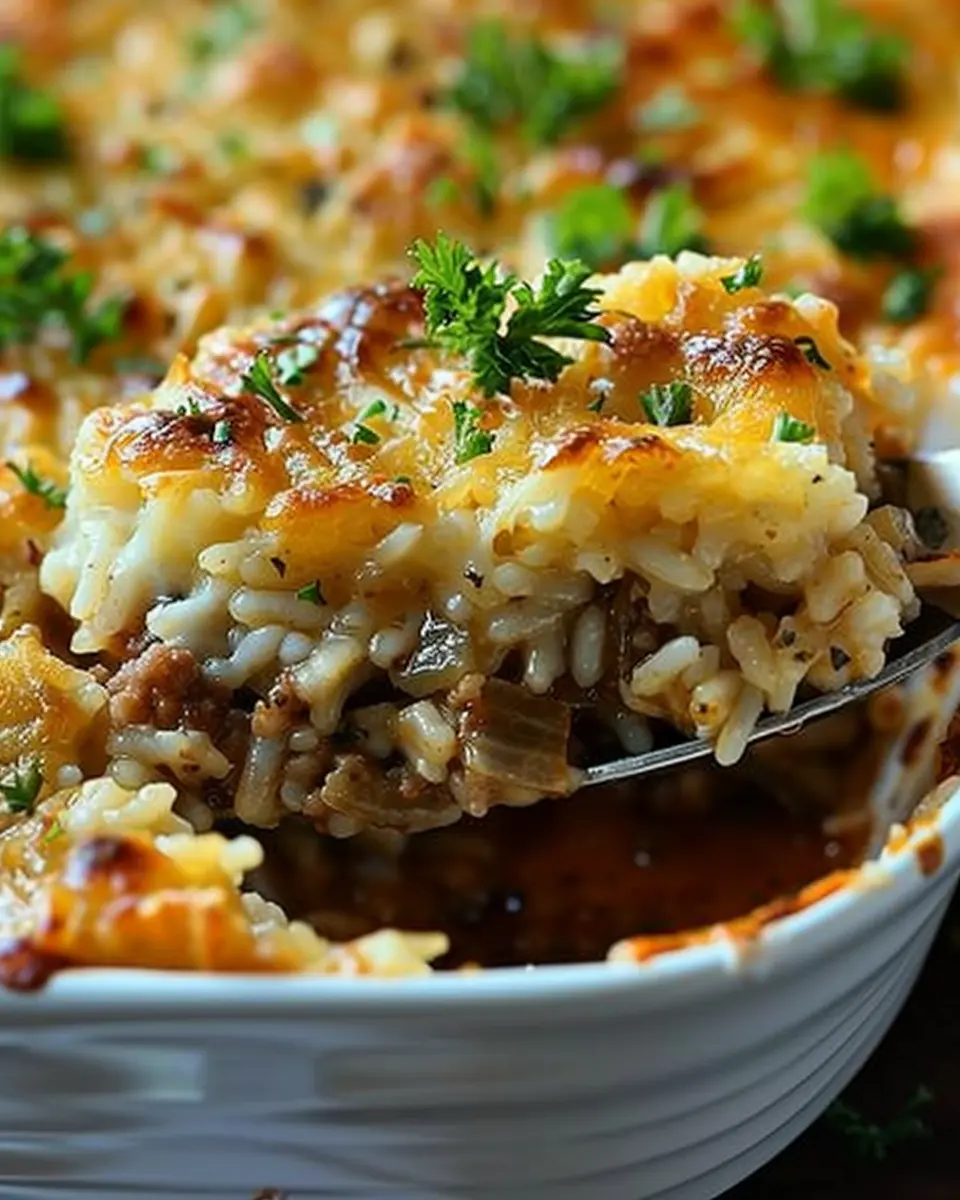 PrintFrench Onion Ground Beef and Rice Casserole: A Cozy Comfort Dish