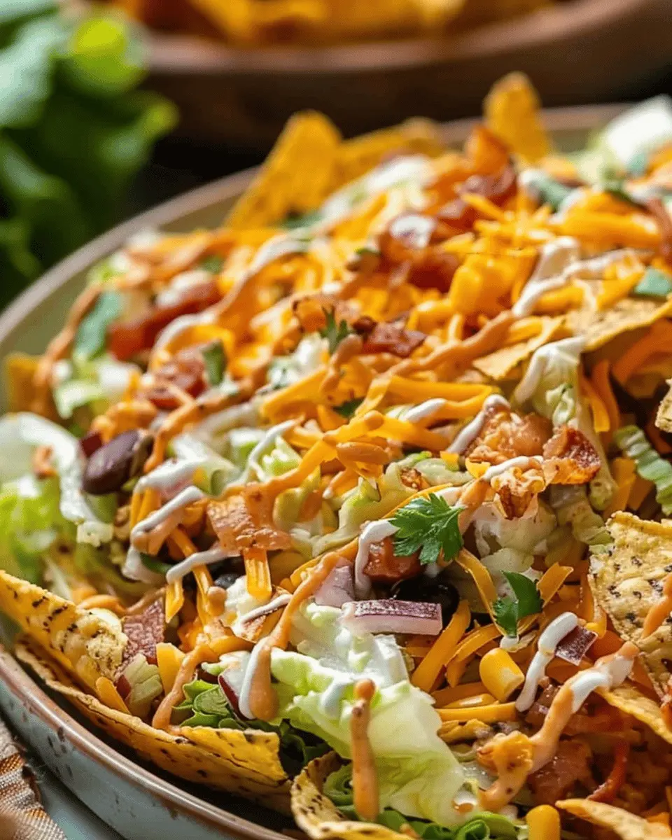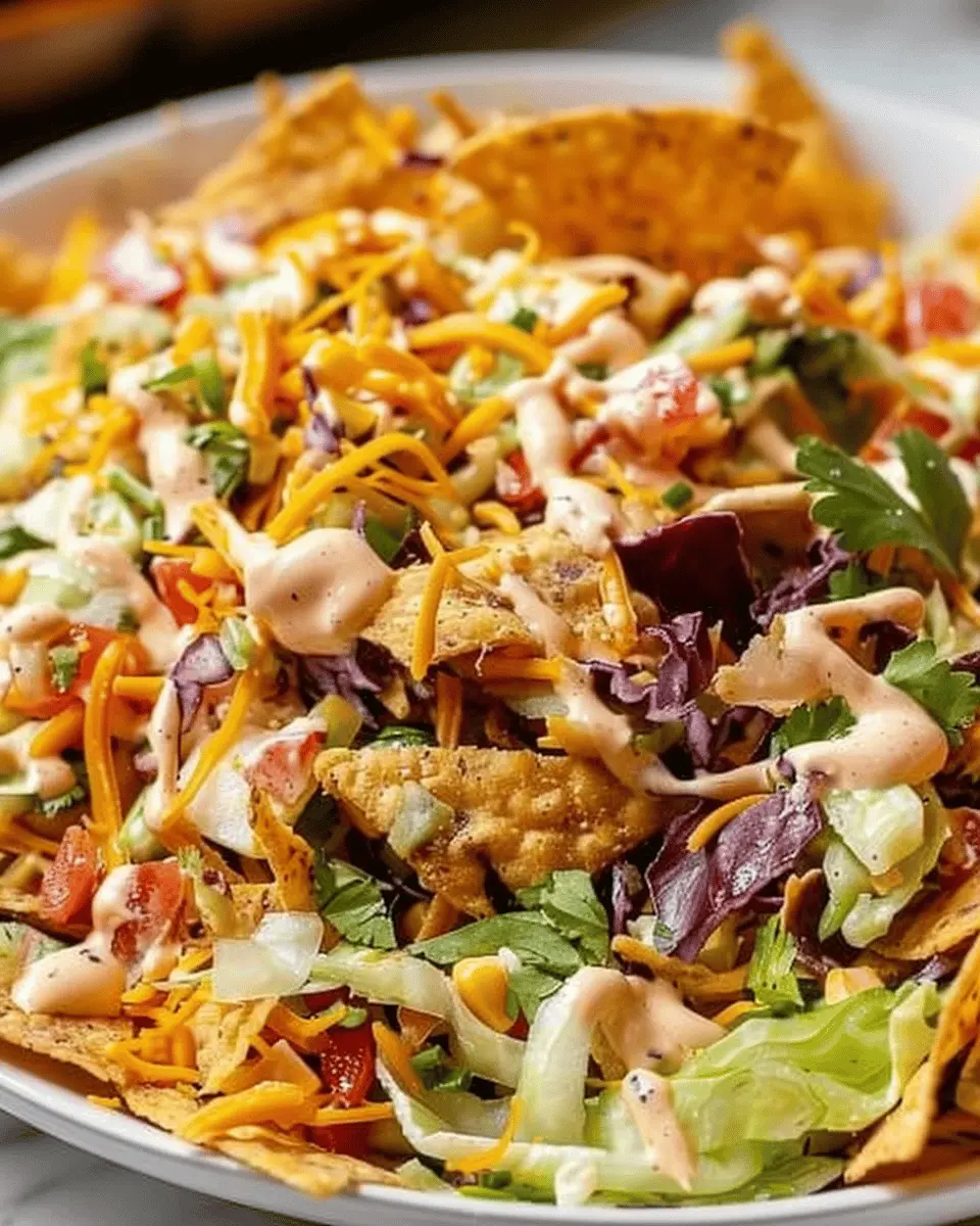 It’s time to bring the salad and dressing together! Pour the chipotle dressing over your salad mix and toss gently until everything is coated. This step is crucial; the dressing binds all the flavors, ensuring every bite is a satisfying explosion of taste. If you’re prepping this dish ahead of time, you might want to keep the Fritos separate until just before serving to maintain their crunch.