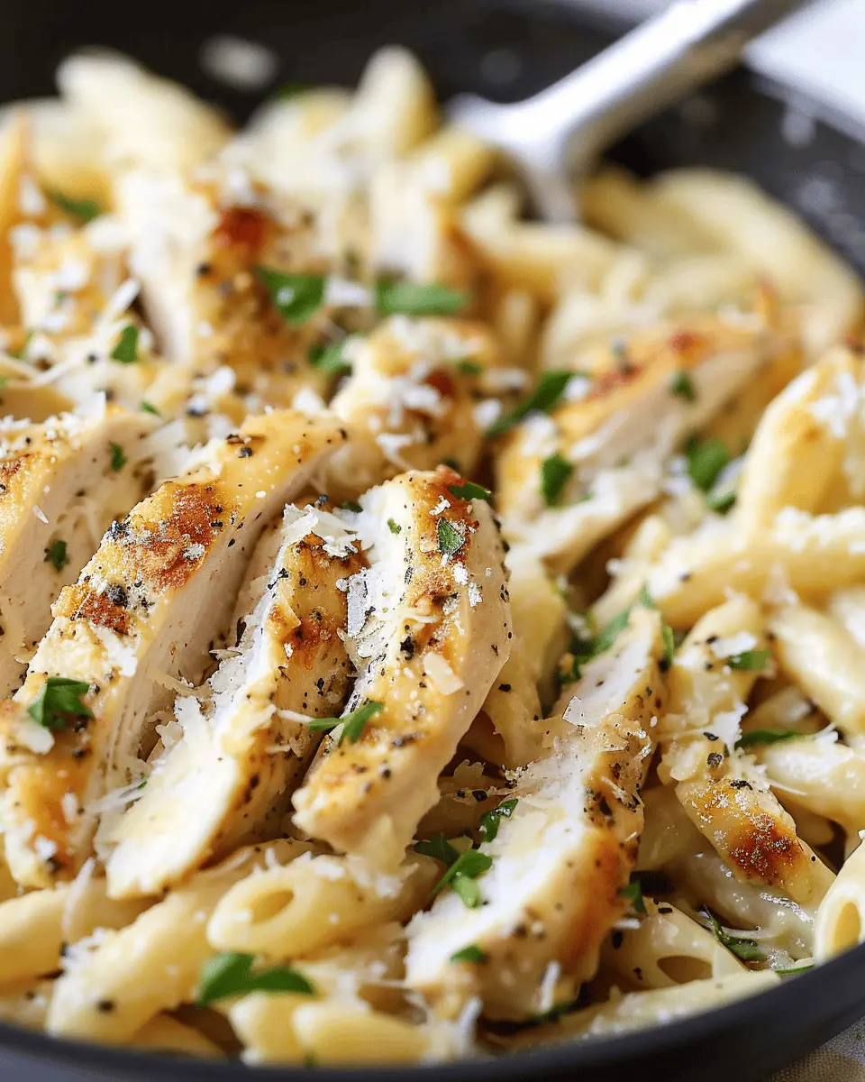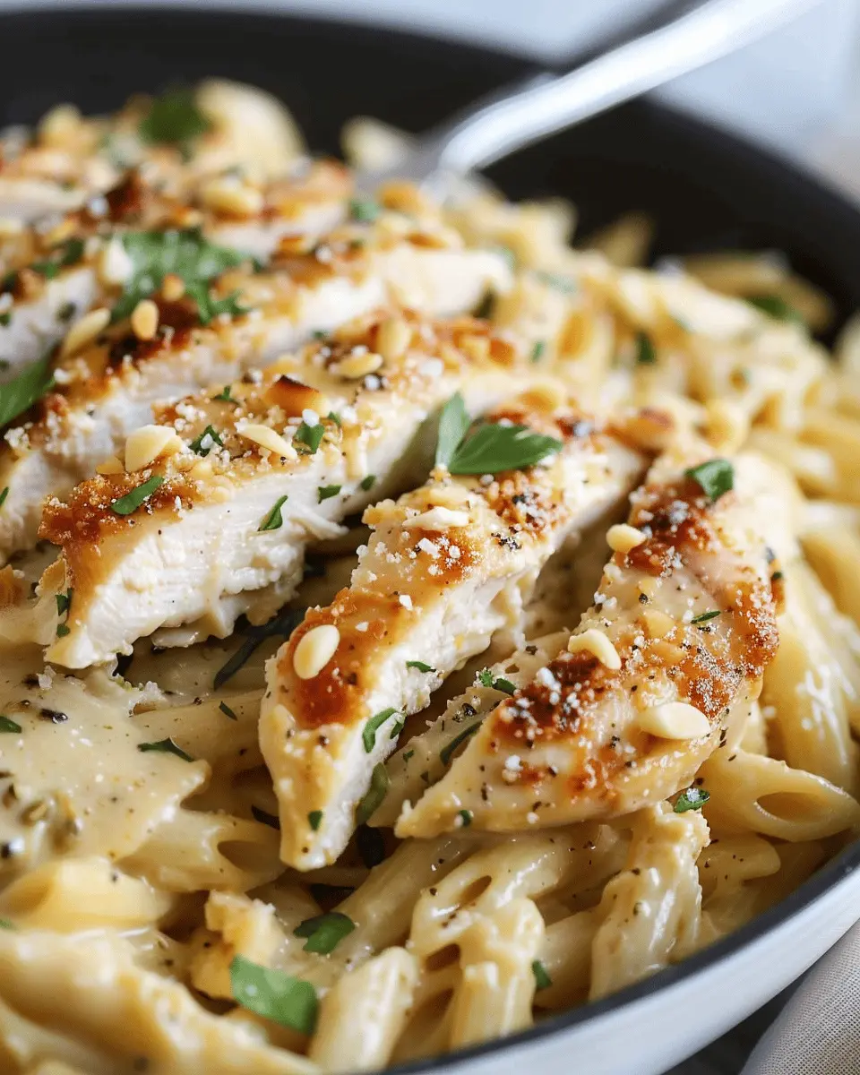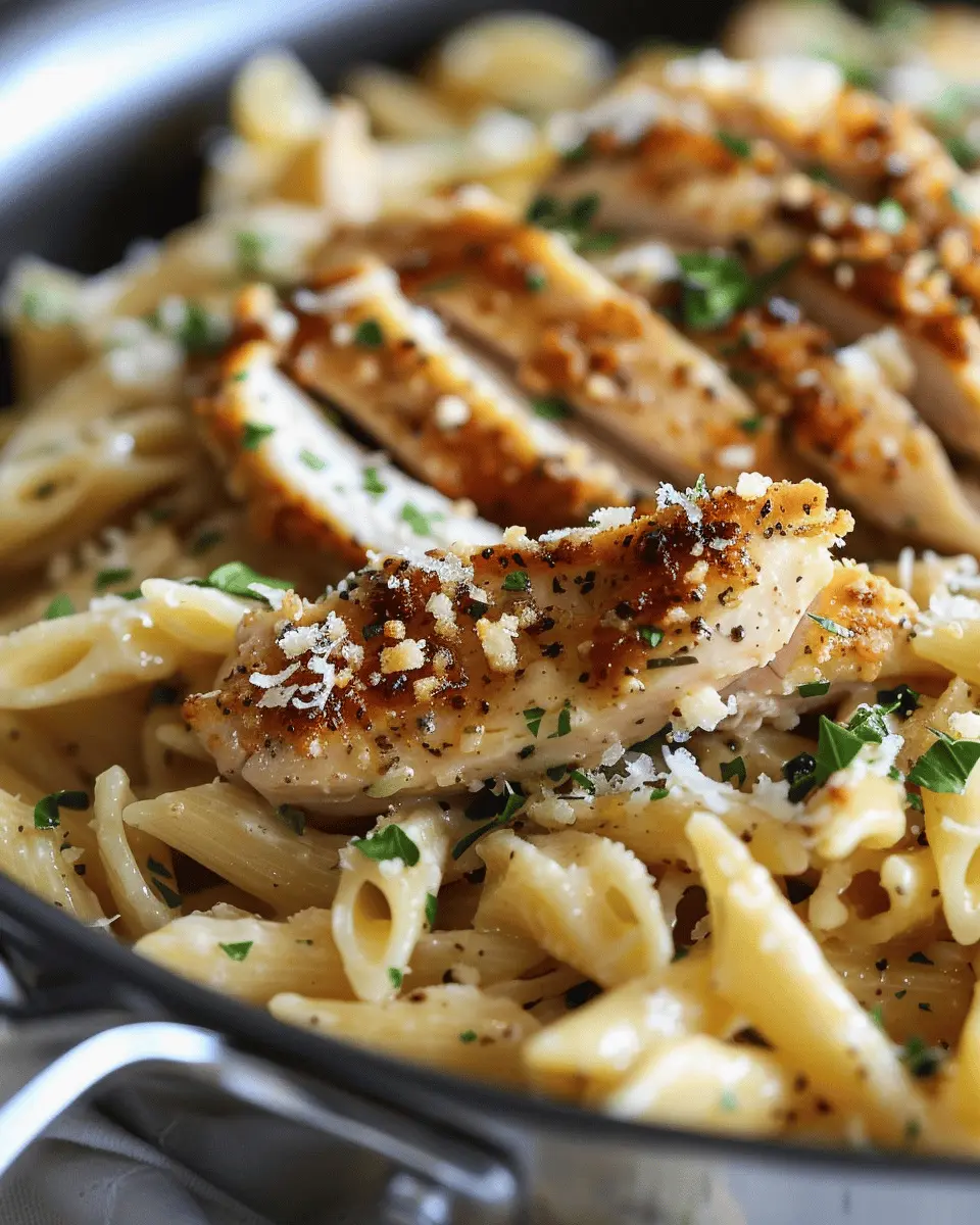 Finally, add your cooked pasta to the skillet with the Garlic Parmesan Chicken. Toss everything together gently to coat the pasta in that delicious creamy sauce, ensuring that every bite is a flavorful explosion. Season with additional salt and pepper as needed.