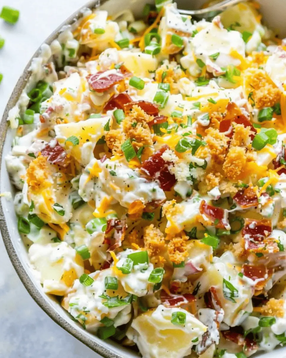 This Loaded Baked Potato Salad enhances the classic recipe with turkey bacon and chicken ham for a deliciously indulgent twist.