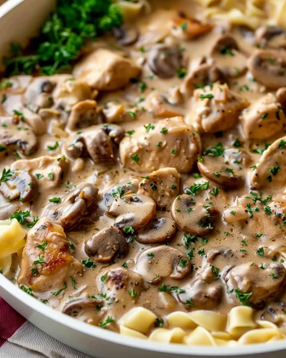 • Serve it up: Prepare a bed of egg noodles, rice, or even mashed potatoes — whatever you fancy. Spoon the Rich Chicken Stroganoff atop, garnishing with finely chopped parsley for a pop of color and freshness.