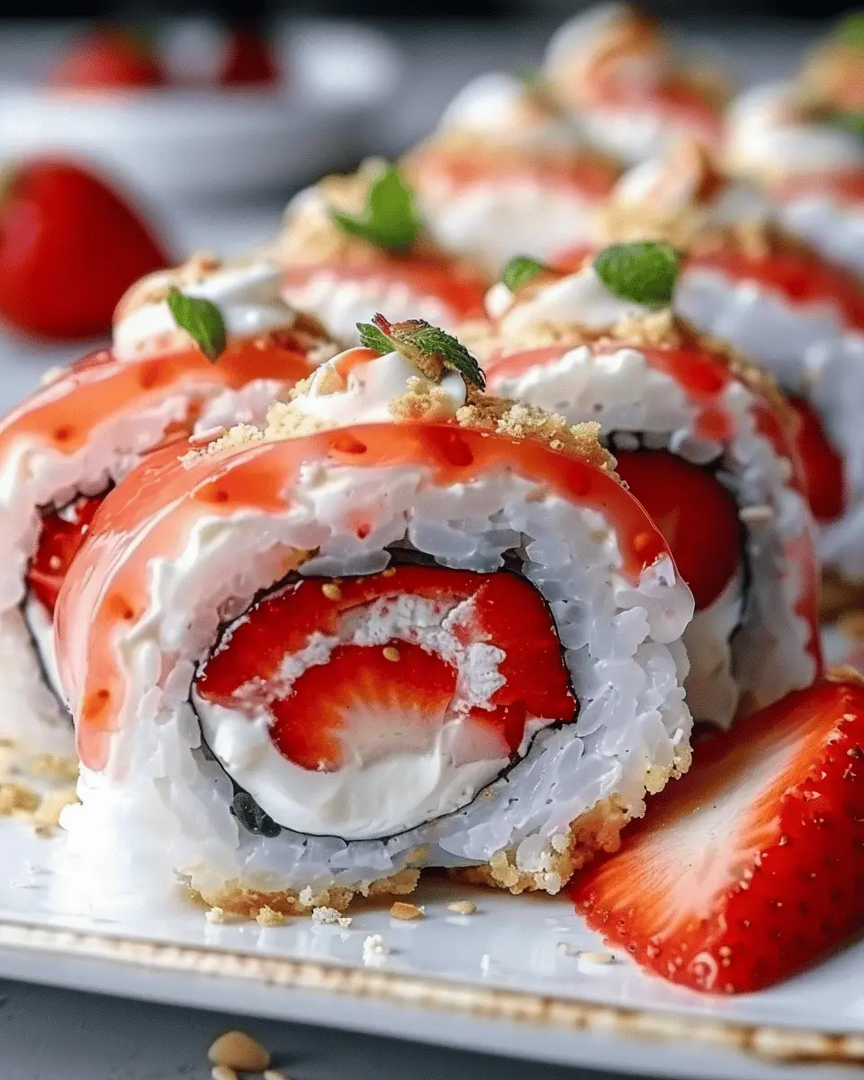 Creating an eye-catching display for your strawberry shortcake sushi roll is just as essential as the taste. Think vibrant colors and fun textures! Slice the rolls into pieces showcasing the bright red strawberries against the creamy filling, and present them on a sleek white plate. Garnish with fresh mint leaves for an added pop of color, and drizzle with a light strawberry sauce or chocolate for visual appeal. Consider serving on a wooden platter for a rustic touch, or place individual pieces into colorful cupcake liners for a playful, personalized presentation.