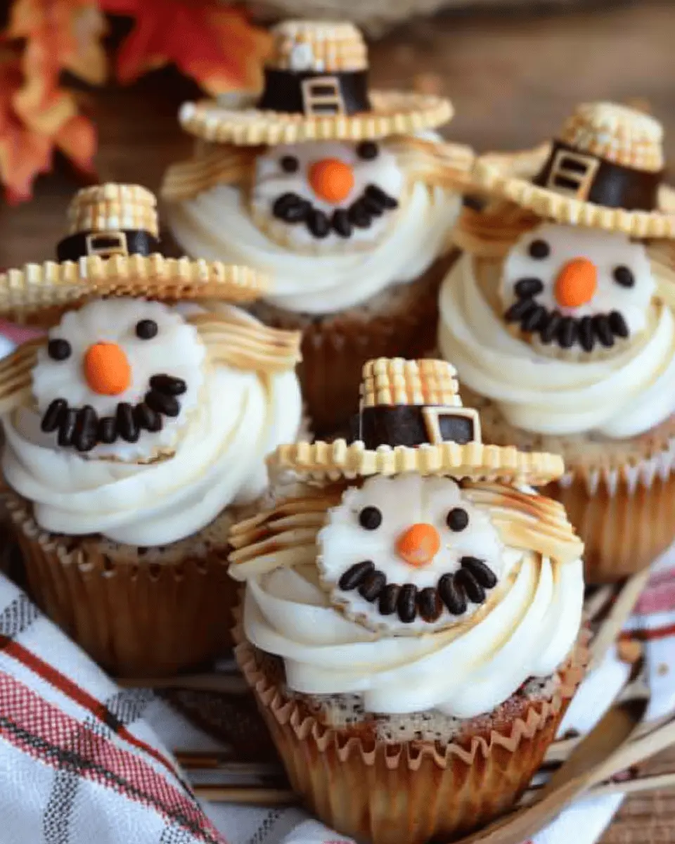Delightful scarecrow-themed cupcakes are perfect for celebrating the fall season with joy and creativity.