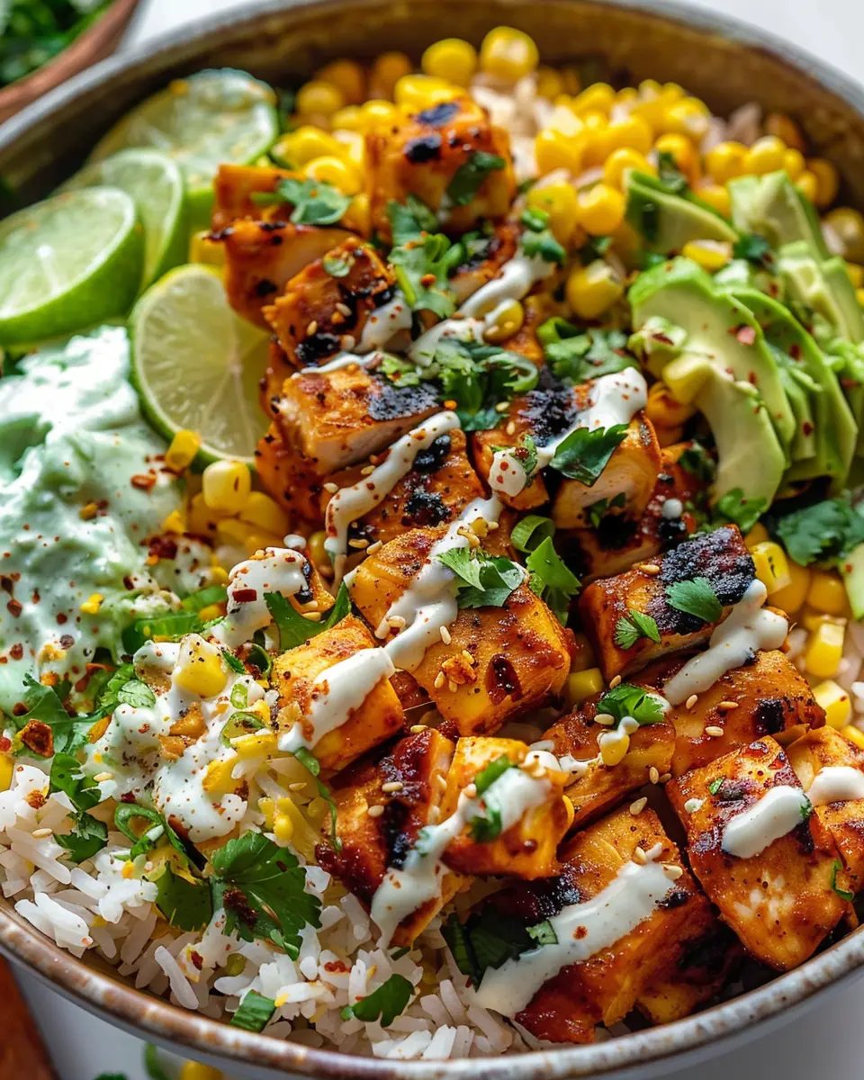 If you’re looking to try a meat-free version of the tasty street corn chicken bowl, simply swap out the chicken for hearty ingredients like grilled zucchini or roasted chickpeas. They not only provide satisfying texture but also pack a protein punch! Add in some black beans for extra fiber and a colorful array of grilled veggies like bell peppers for added flavor. Top off your bowl with a generous drizzle of lime crema or avocado dressing for that creamy goodness without any animal products.